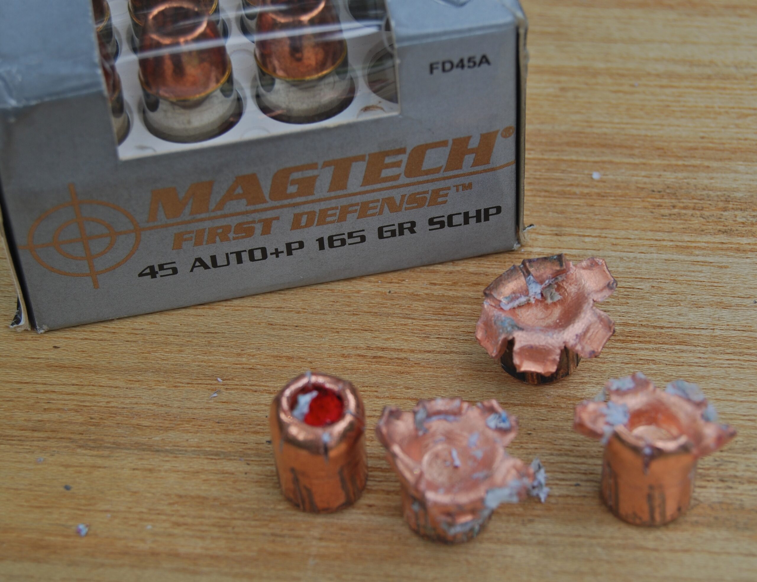 Magtech First Defense bullets have been designed to expand reliably by using a series of cuts in the projectile to aid and guide bullet expansion. As you can see by the attached photo, we had great success. These four Magtech First Defense bullets were fired through two layers of thick leather, followed by 4 layers of light canvas, into a wetpack backstop. As the photo shows, three of the four projectiles expanded well even after passing through very tough barriers.