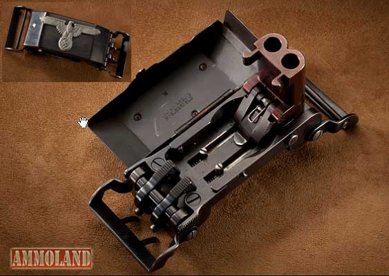 Early BAR men were issued an automatic rifleman’s belt with a special metal “cup” between the BAR magazine pouches and pistol magazine pouch. This cup was intended to support the BAR’s stock as the shooter fired from the hip in a concept called “walking fire.”