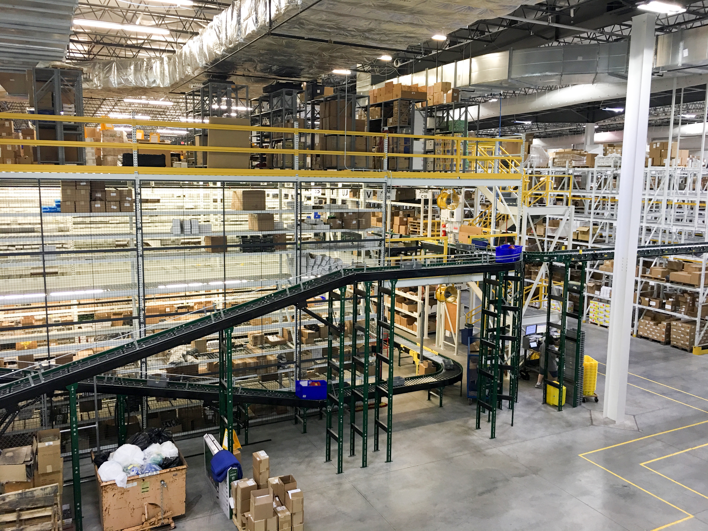 The part of the warehouse that stocks smaller items is three stories tall. Automated conveyors weave through that, allowing pickers to drop items into bins. The system moves bins to the next relevant area based on what items are on the orders.