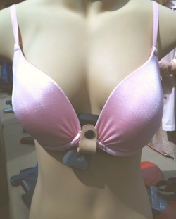 I’m a happily married guy, and here I am talking to Lisa, closely examining a mannequin of a woman’s breasts, complete with a pink brassiere. With hundreds of tough lookin’ NRA dudes staring at me. It got a lot more interesting when Lisa had to ask a group of women examining the new Flash Bang Bra Holster to step back so I could take some close up photos.