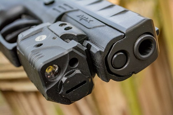 Since the laser can’t be in the center of the bore itself, it’s (by definition) offset from the path of the bullet. That means that, like a rifle and scope, you have to choose a distance at which the laser beam and bullet path will intersect. Let’s walk through the zeroing thought process using a Beretta APX RDO pistol. This pistol has a rail forward of the trigger guard, so I mounted a Crimson Trace Railmaster Pro.