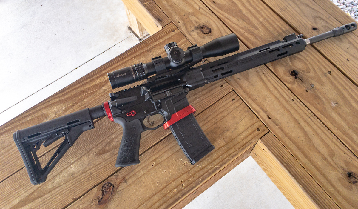 I absolutely love the handguard on this rifle. It’s an MLOK-compatible guard (over a free-floated barrel) that comes with one (bright red) quick detach sling point already mounted on the left side. Of course you can certainly remove or relocate it. There are MLOK attachment points close to the receiver and again near the muzzle at the 1:30, 3:00, 4:30, 6:00, 7:30, 9:00, and 10:30 positions. In the center where your support hand naturally rests there are not holes but subtle MLOK-shaped indentations. That helps keep your hand cool as barrel heat is shielded by the handguard itself.