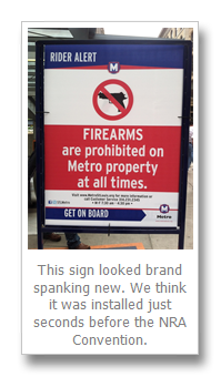 Taking an example from the MetroLink’s sign program effectiveness, the Americas Center also prohibits weapons through the use of signs. While these rules seemed effective on the NRA Annual Meeting attendees, as there were hardly any mass shootings at the fresh lemonade stands, gun industry employees are clearly very, very bad people. Signs or no signs, they brought tens of thousands of their guns into the show. So signs only work most of the time, not all the time – hence the need for more aggressive tactics like window stickers.