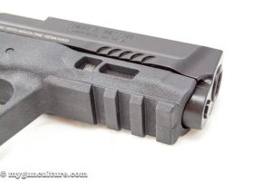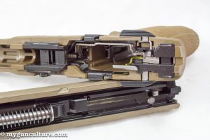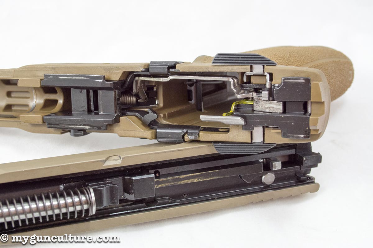 - An internal change in the M&P 2.0 pistols is a longer internal chassis, visible here through the ports in the dust cover.