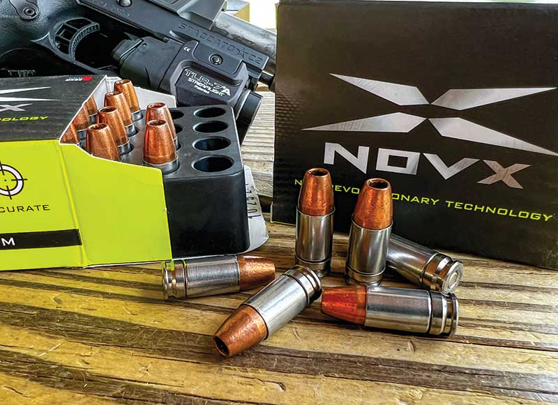 And now for something a little different. NOVX Pentagon ammunition uses a patented two-piece stainless steel case instead of the de facto standard “brass.” Why? Weight is a factor. I weighed an empty case and came up with 32.8 grains. A comparable brass case is about 62. So, we’re talking a weight savings of nearly half. If you’re wondering, that works out to about 1 oz. per 15-round magazine. I did check case volume, too — it’s about the same.