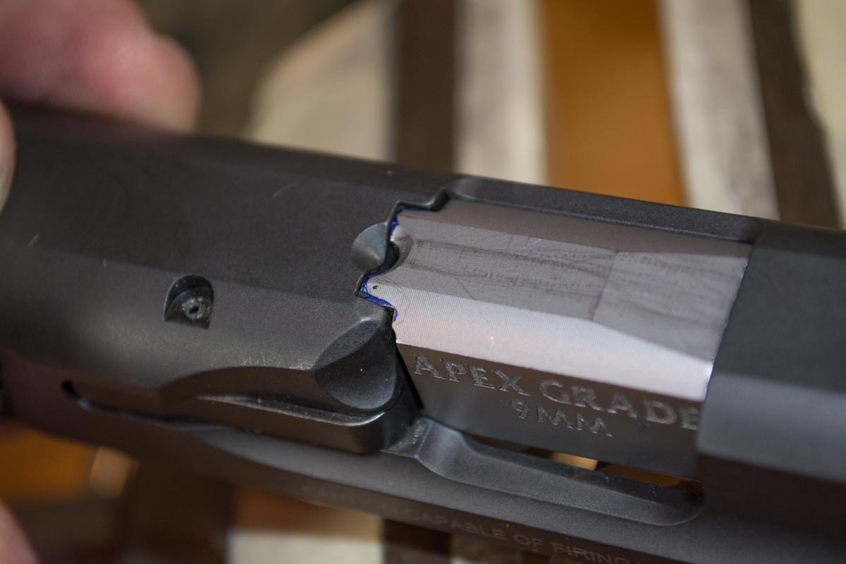 I had to do a little tweaking with the fine diamond hone in just a couple of places to “semi-drop-in” the new barrel. First, I had to remove a bit from the ten and two o’clock positions in the exterior of the muzzle. Apex adds a little extra metal there for purposes of letting you file down to get a tight fit. Before I did this step, the barrel wouldn’t go into the slide at all. Adding a little Dykem marker allowed me to make sure I was only filing in the ten and two o’clock areas.